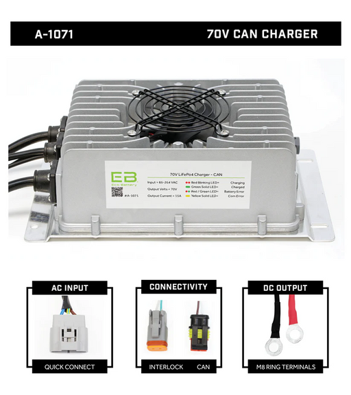 Eco BatteryEco Battery 70V CAN 15A Charger This charger is designed to charge 70V Eco Lithium battery. It has built in safety features through the CANbus conn...