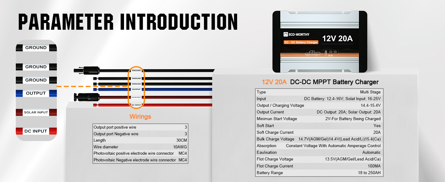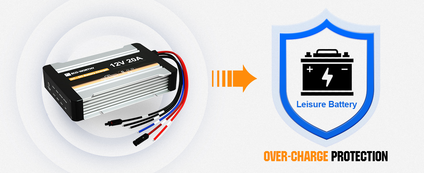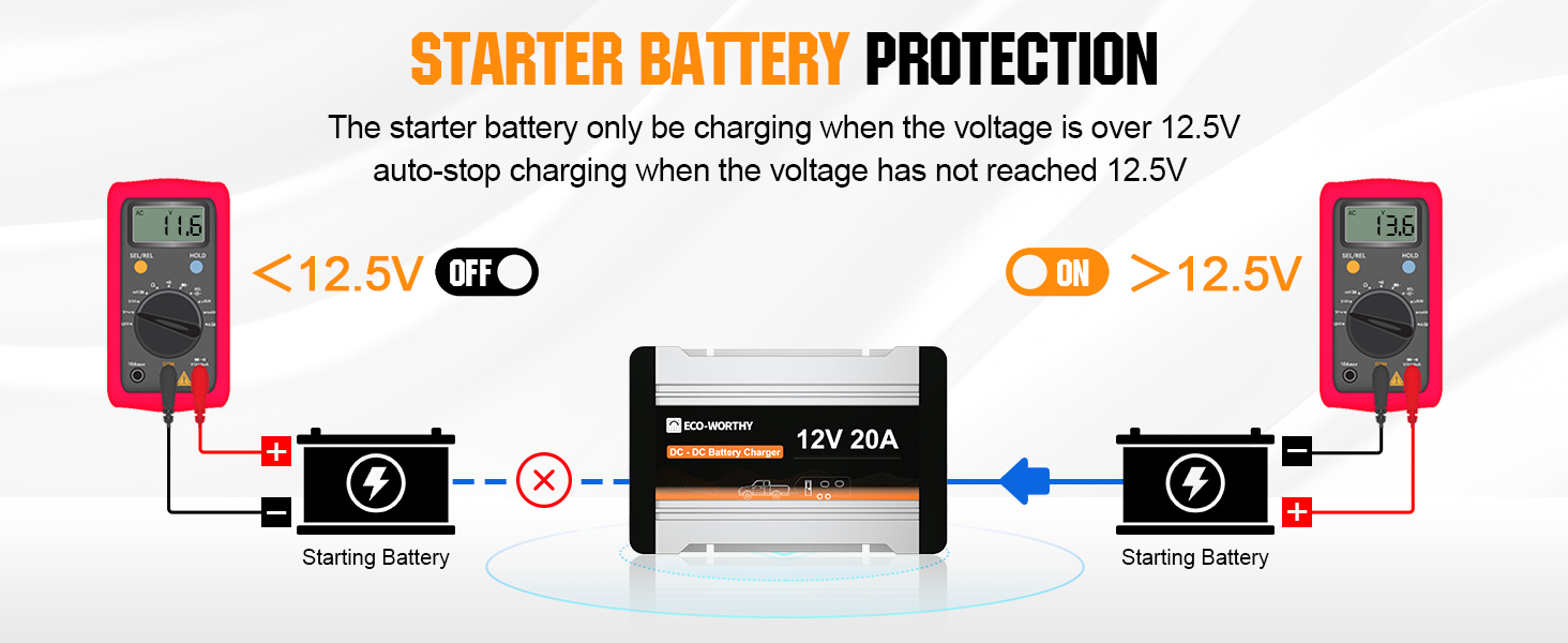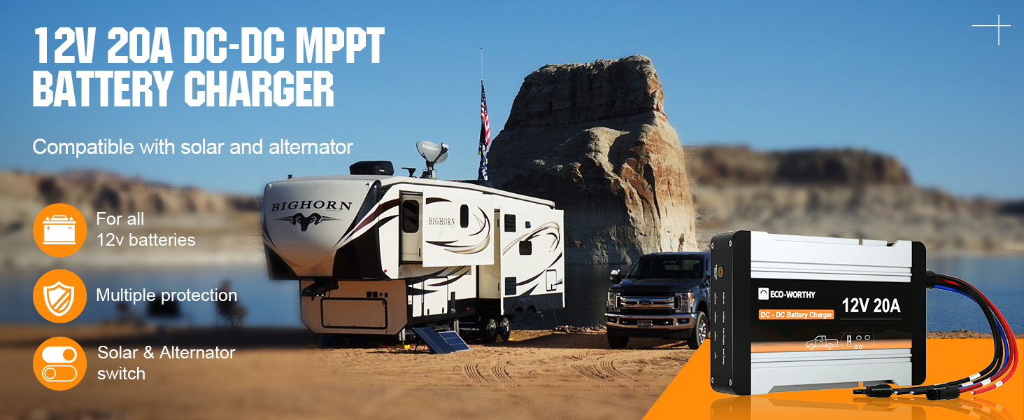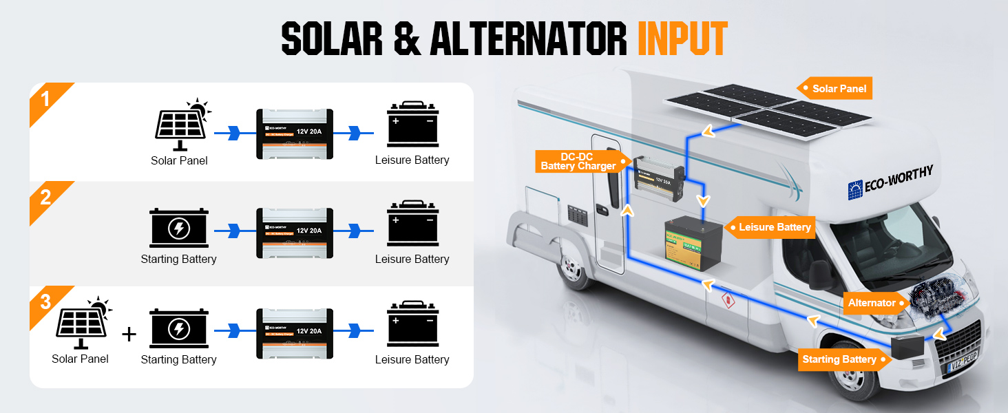 DUAL INPUT CHARGING: The ECO-WORTHY DC to DC charger has unique charging options. This multi-charging stage, dual input battery charger can charge leisure batteries by connecting to the starter battery of automotive alternator or connecting to solar panel. Provides proper charging for AGM/GEL, Lead acid, Lithium and Calcium batteries.